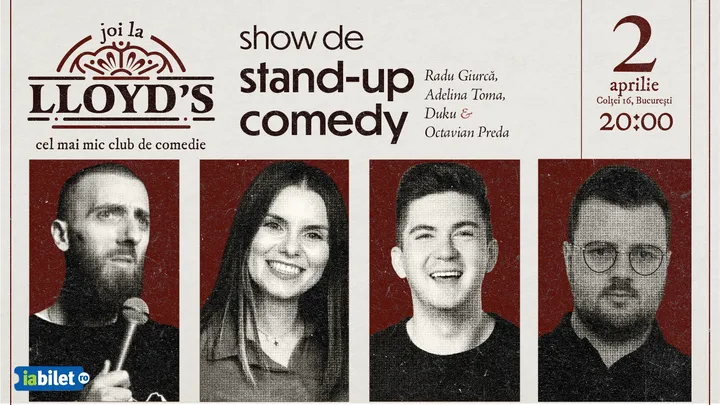 Vineri, 13 septembrie, ora 20:00, la Lloyd's Comedy Pub dăm startul distracției de weekend alături de 4 comedianți talentați care ne vor binedispune cu un Show de Stand-up Comedy plin de umor și energie